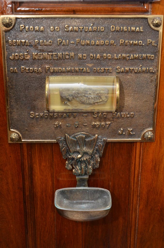 A mudança para a casa na Rua Diogo de Faria é mais um passo para concretização do sonho divino. Como filhas fiéis do Fundador, reconhecem que devem estar com os ouvidos no Coração de Deus e as mãos no pulso do tempo. Mesmo sem ainda terem a propriedade da casa, Ir. M. Emanuele já pensa em assentar a pedra fundamental do primeiro Santuário de Schoenstatt em terras paulistanas, o que acontece em 31 de maio de 1967, depois de apenas um mês de organização desse sonho ousado. Ir. M. Doroteia e Ir. M. Isengard, de visita a Schoenstatt na Alemanha, pedem ao Fundador uma mensagem para o assentamento da pedra fundamental – é o rico testamento para o Santuário de Vila Mariana, a última mensagem do Pe. Kentenich antes de voltar aos braços do Pai.
