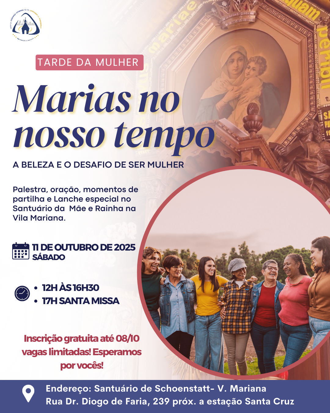 Mulher, esse convite é para você! 💖 No sábado, 11/10/2025, das 12h às 16h30, venha viver uma tarde preparada com muito carinho no Santuário da Mãe Rainha – Vila Mariana/SP.