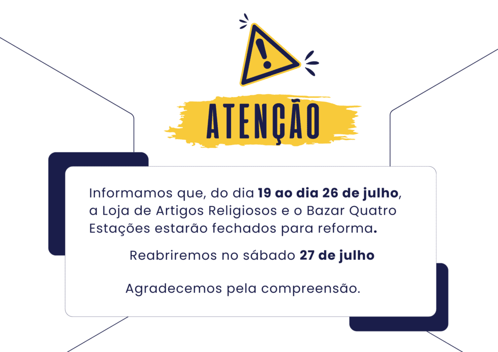 Comunicado Importante Atenção! Informamos que, do dia 19 ao dia 26 de julho, a Loja de Artigos Religiosos e o Bazar 19 de julho de 2024