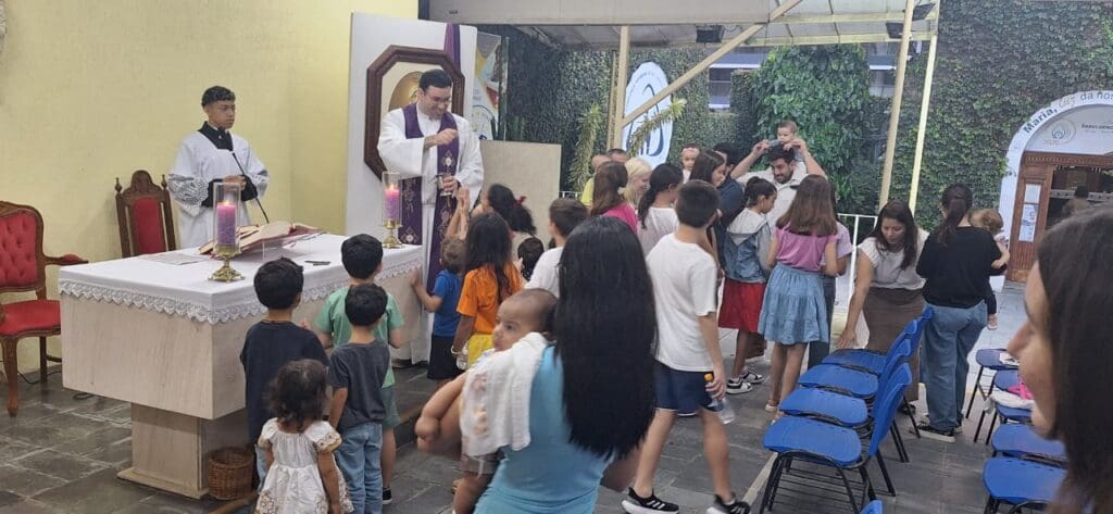 Embora a consagração tenha sido realizada de forma particular, outras crianças presentes na celebração também receberam uma bênção especial, estendendo a todas as famílias esse gesto de carinho e proteção materna.