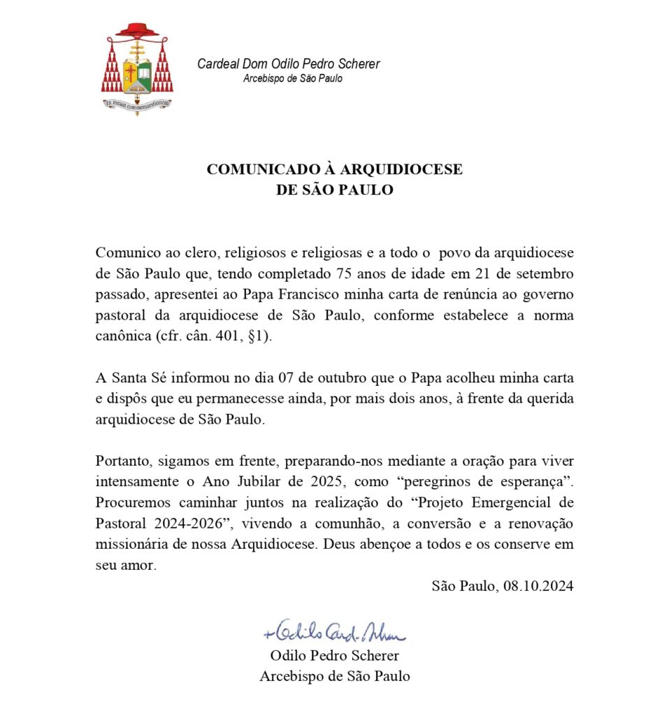 Seguindo a norma da Igreja Católica, o Papa Francisco aceitou a renúncia do arcebispo da Arquidiocese de São Paulo que completou 75 anos. Ele permanecerá no cargo até o final de 2026.